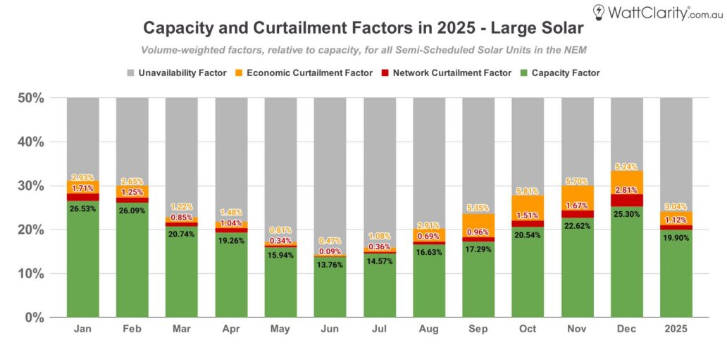 In the next three charts, we examine production, network curtailment and economic curtailment relative to installed capacity across the full 2025 calendar year.