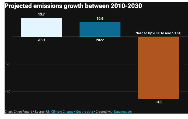 That’s far off track the 45% reductions scientists say are needed to keep 1.5C within reach.