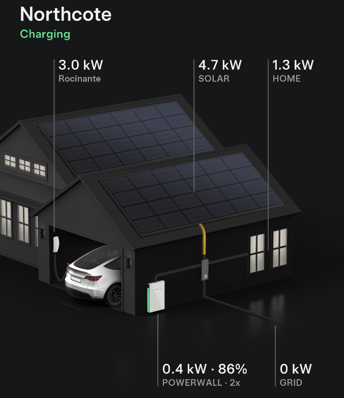 Here is an example above. Even with just 4.7 kW of rooftop output, some is going to the car, some to the battery, some to the house. All can be adjusted according to needs and wants.